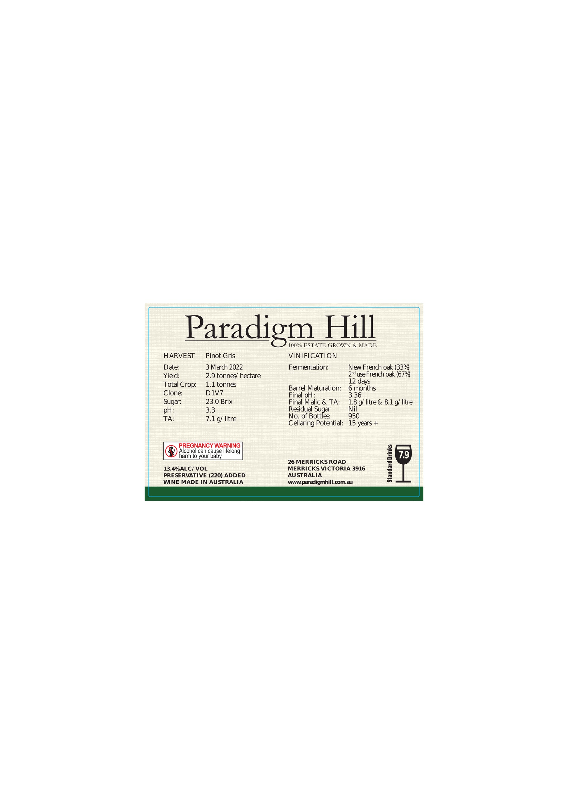 The Pinot Gris is crushed and stems removed. The must is left to soak a while before pressing off the juice & overnight cooling before the clear juice is fermented in French oak barrels – one-third new Vosges forrest sourced oak is used [16oC to 18oC]. Batonage [mixing the wine and lees] takes place monthly and the finished wine is bottled after a further 6 months. Spices blend with vibrant exotic fruit aromas and are layered on a citrus backbone – also seen on the palate. The luscious nature of this wine is supported by a rich texture and persistence of flavours leave lingering enjoyment! Whilst our Pinot Gris drinks well whilst young – we can confidently predict a gracious evolution of the wine over a number of years of cellaring.